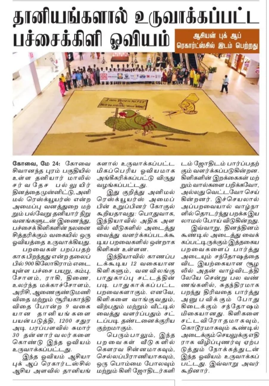 Recognized by the Asia Book of Records as the largest grain artwork in Asia, it highlights the importance of protecting parrots, India’s 12 legally protected parrot species, and raises awareness against keeping them caged.